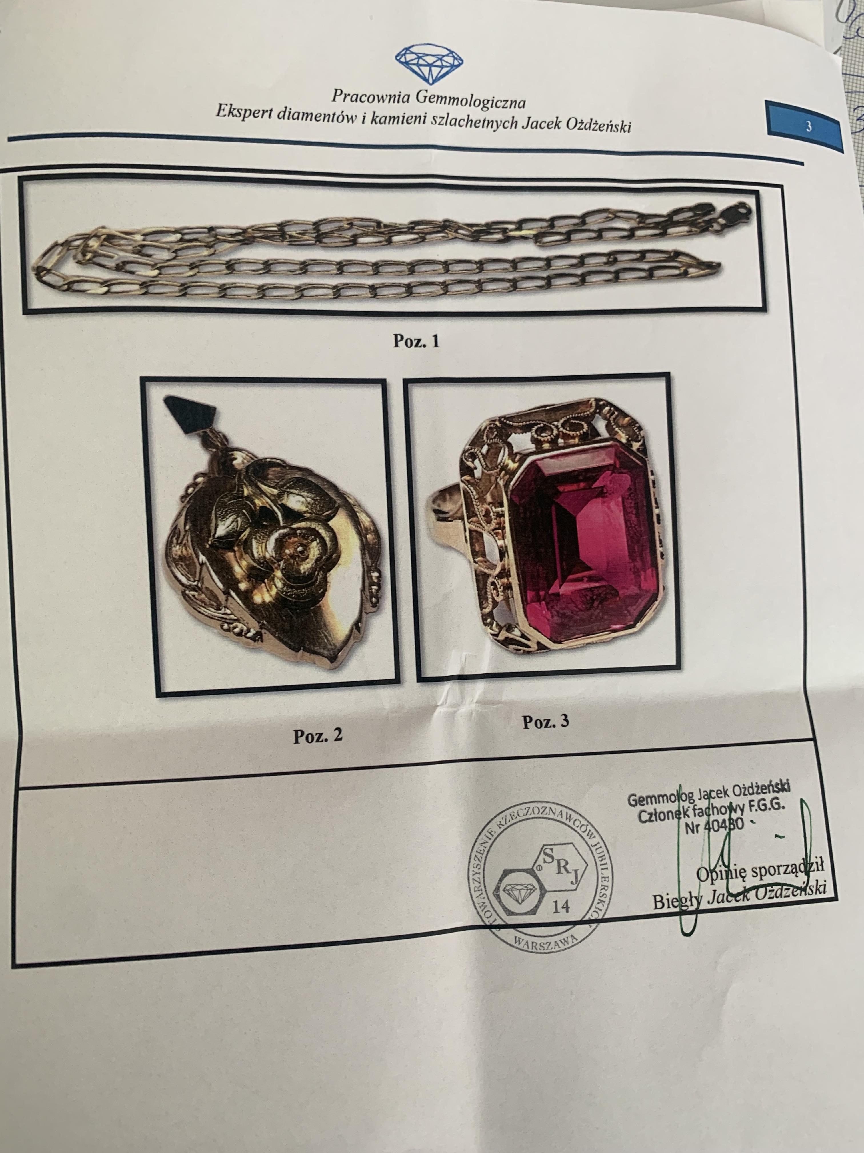 | 2 | Złota zawieszka z motywem kwiatu róży | 1900,00 zł | 1425,00 zł | Masa: 4,820 g, złoto żółte pr. 0,585, sprawny, ślady użytkowania, słaba jakość wykończenia |
