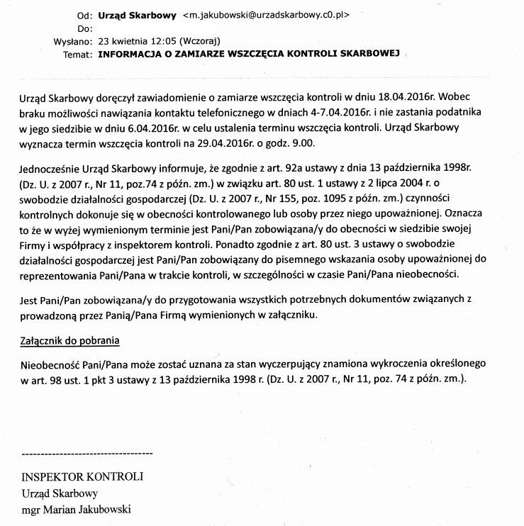 Autor wiadomości informuje o doręczeniu zawiadomienia o zamiarze wszczęcia kontroli, próbie nawiązania kontaktu telefonicznego oraz prosi o otwarcie linku znajdującego się we wiadomości.